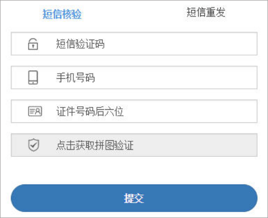 3.依次填寫驗證信息(驗證碼、手機號碼、證件號碼后六位)并完成圖形驗證,單擊【提交】按鈕。
