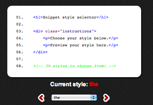 Snippet是一個(gè)很酷的jQuery語(yǔ)法高亮插件,基于SHJS腳本,你可以在SourceForge上找到源碼。