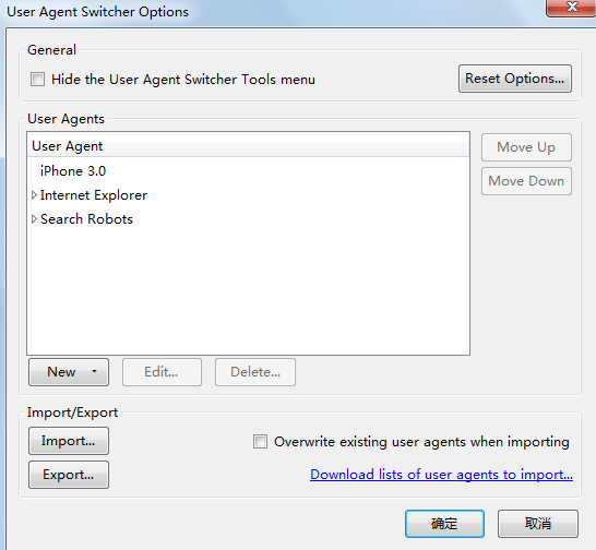 選擇“EditUser Agent”或“UserAgent Switcher”=>"Options",打開如下的設(shè)置頁面。