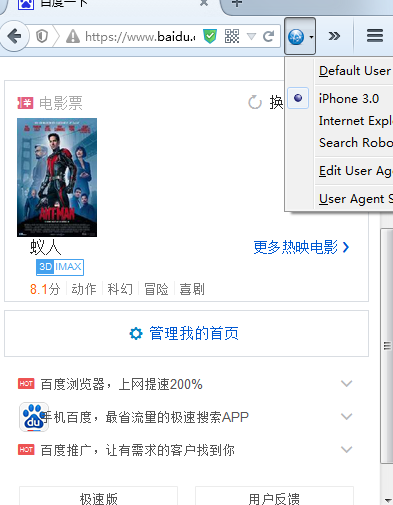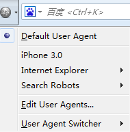 完成后,點擊工具欄上的按鈕,打開UserAgent Switcher的菜單
